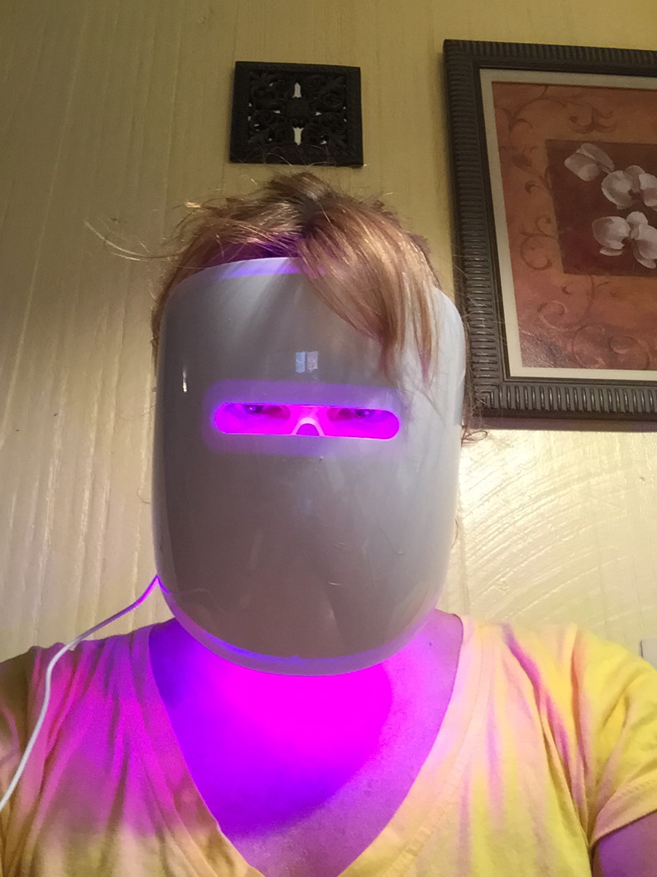 I bought this nifty violet-light-powered beauty mask because nobody over 40 should have both acne and wrinkles, but mostly because it’s a fantastic way to embarrass my kids.